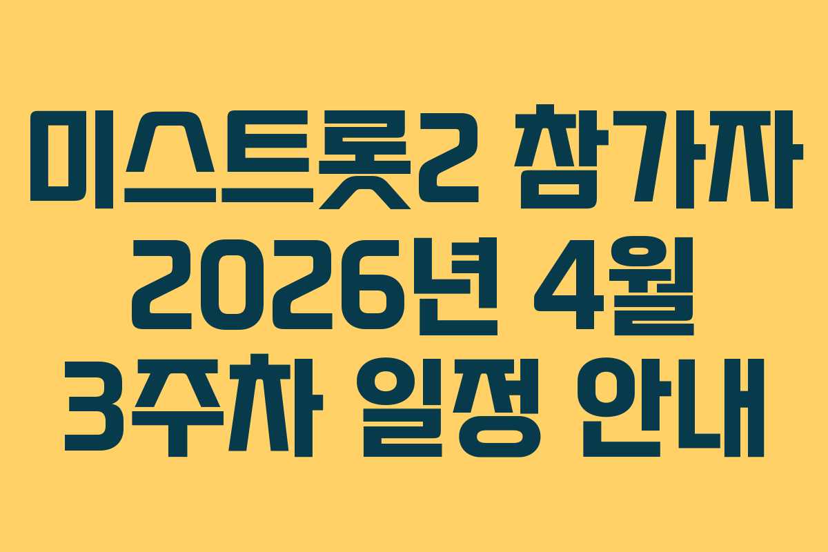 2026년 4월 3주차에 미스트롯2 참가자들의 다양한 일정이 이어집니다. 이 시기에 여러 방송 및 공연 일정이 계획되어 있어 팬들과 관객들에게 많은 볼거리를 제공할 예정입니다. 각 참가자들이 어떤 활동을 진행하는지 살펴보도록 하겠습니다.